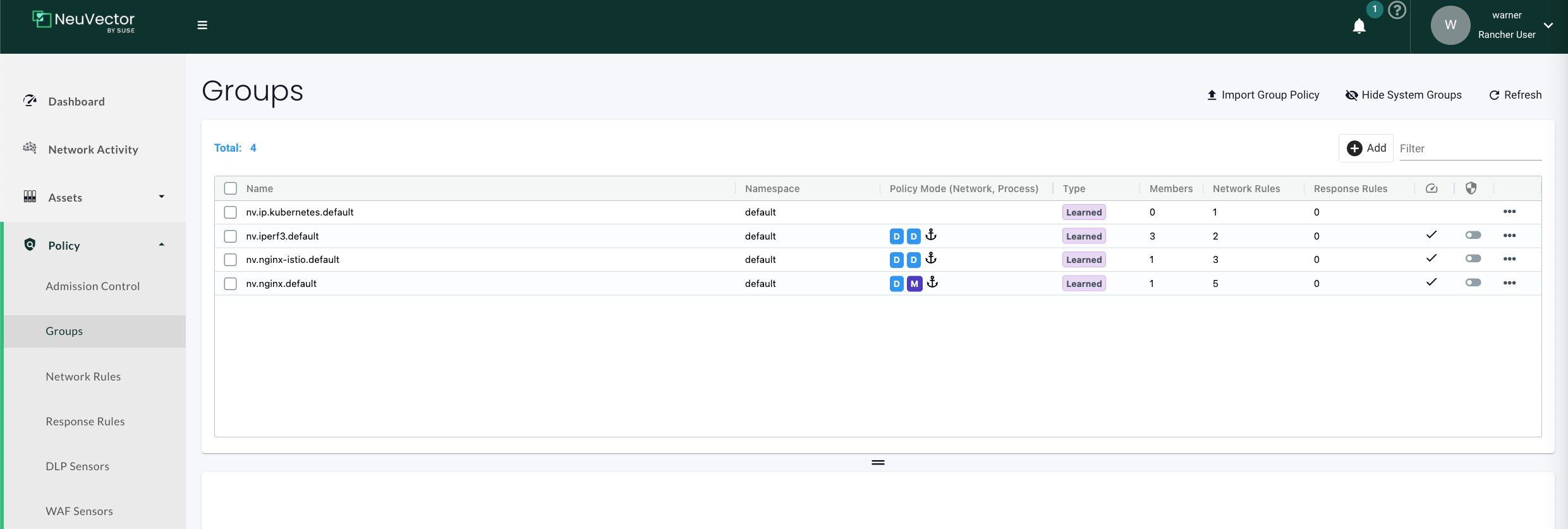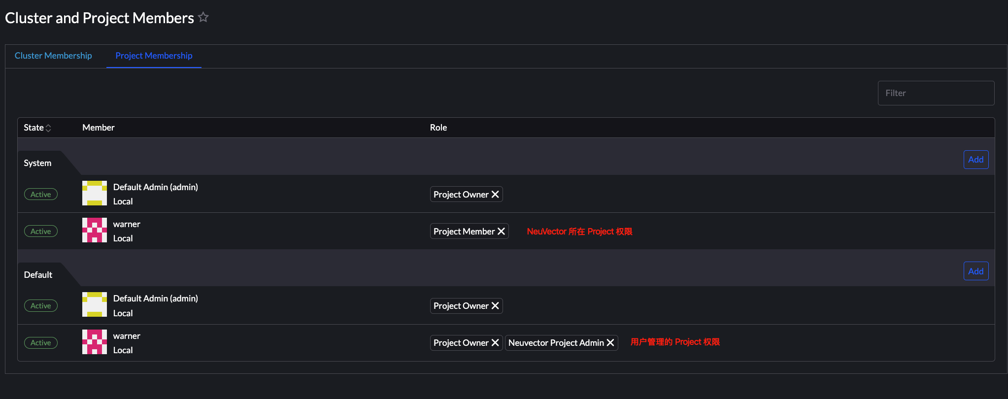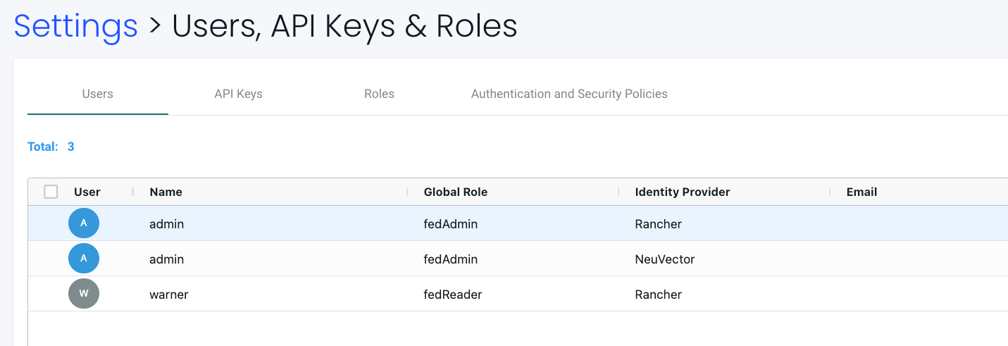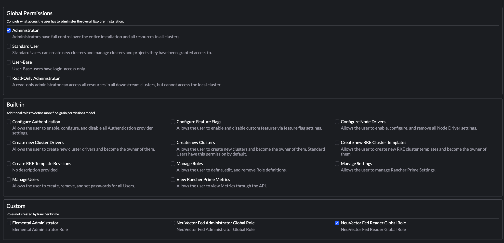 NeuVector 从 v5.4 版本起,通过 Rancher 登录到 NeuVector 的用户无法在 NeuVector 被设置为 Fed 角色,需要在 Rancher 中设置对应的角色,从而映射到 NeuVector 中。