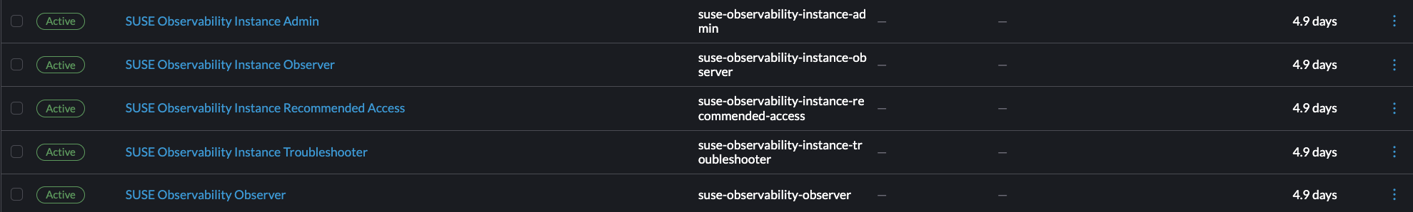 Rancher 也内置了一些角色,使用户能够通过不同的角色访问 SUSE O11y: