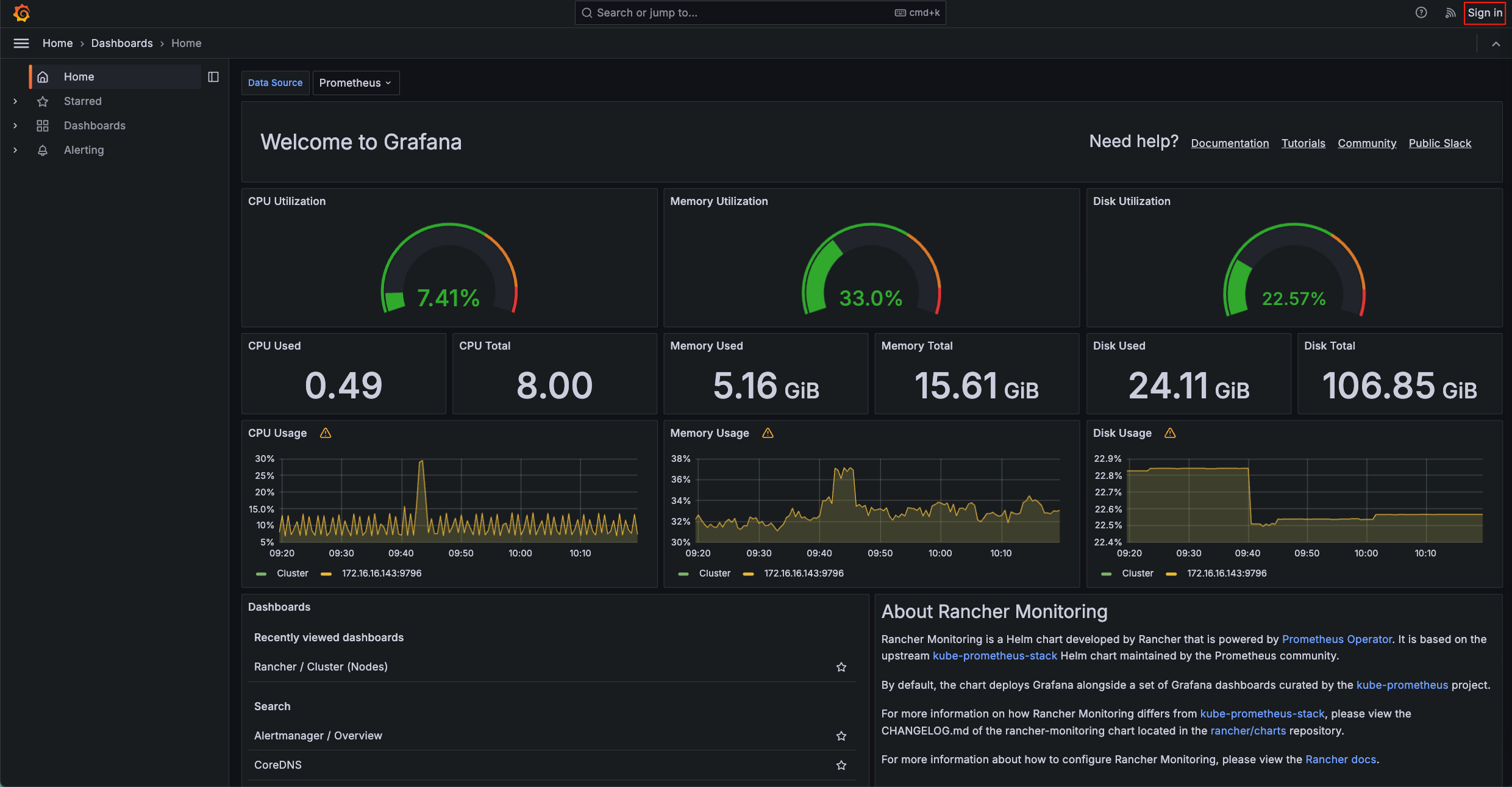 安装/更新完成后,通过 Rancher/Ingress 访问 Grafana,点击右上角的 Sign in: