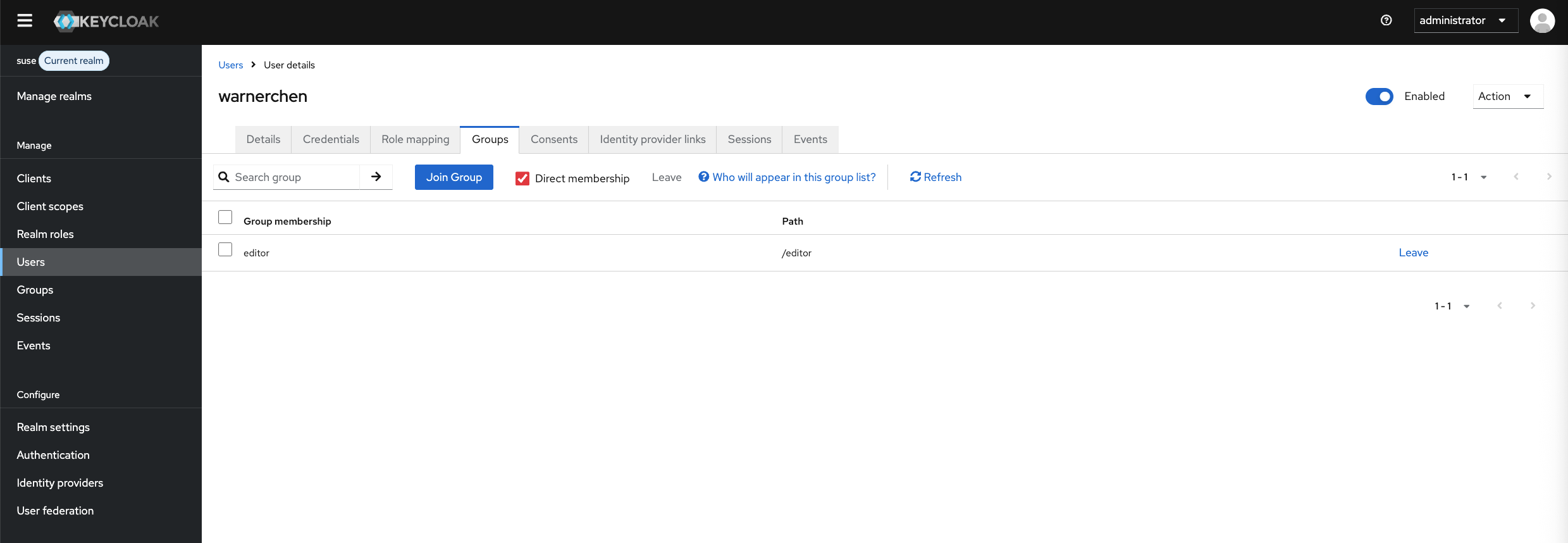 创建一个 User,将其添加到其中一个 Group 中,此处选择 editor: