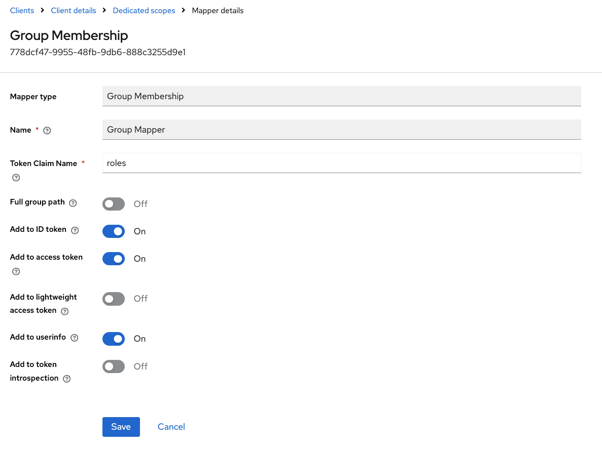 在 Client scopes -> grafana-dedicated 中,创建一个 Mapper: