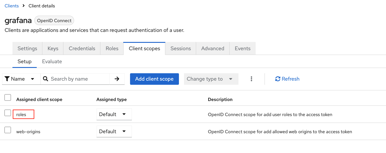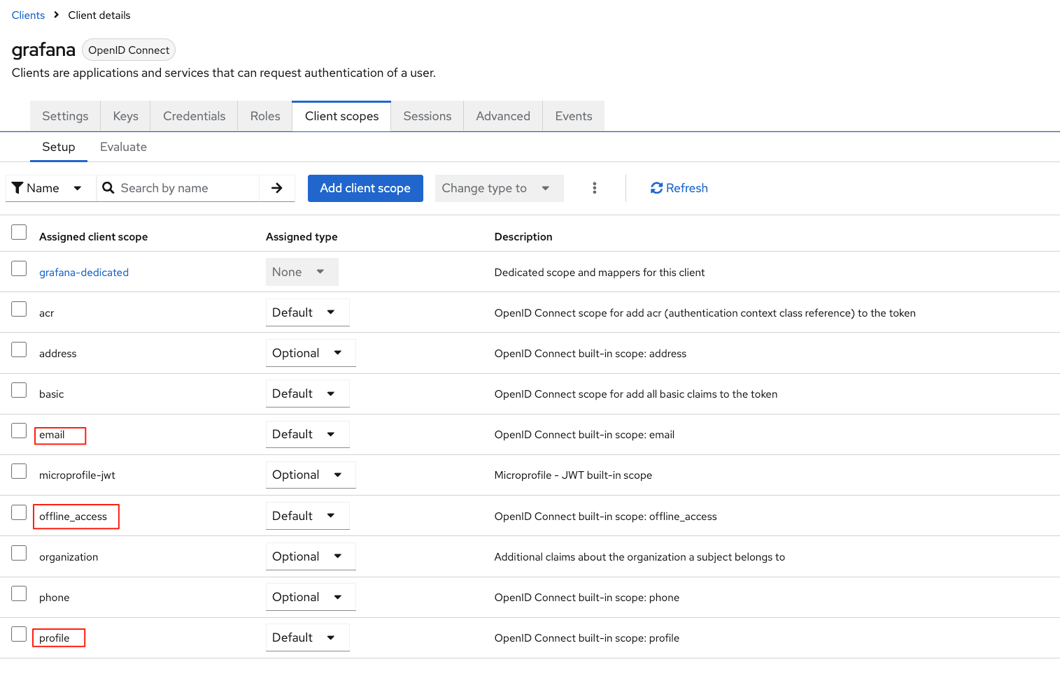 在 Client scopes -> Setup 中,将 email/offline_access/profile/roles 设置为 Default: