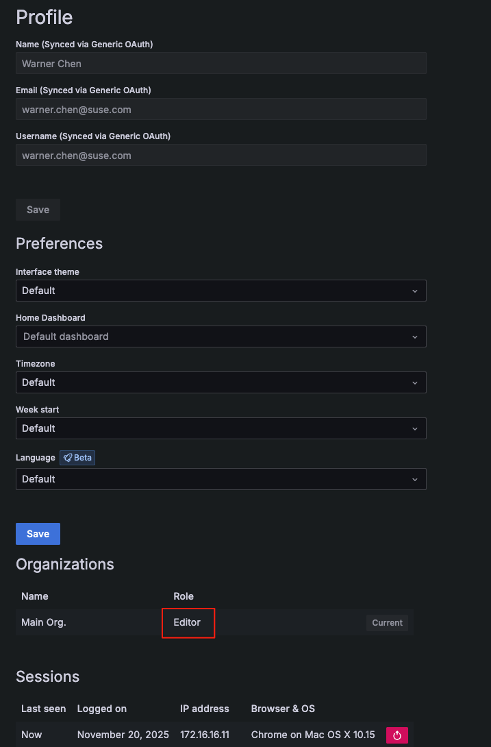 登录成功后,查看 Role 为 Editor,说明配置成功: