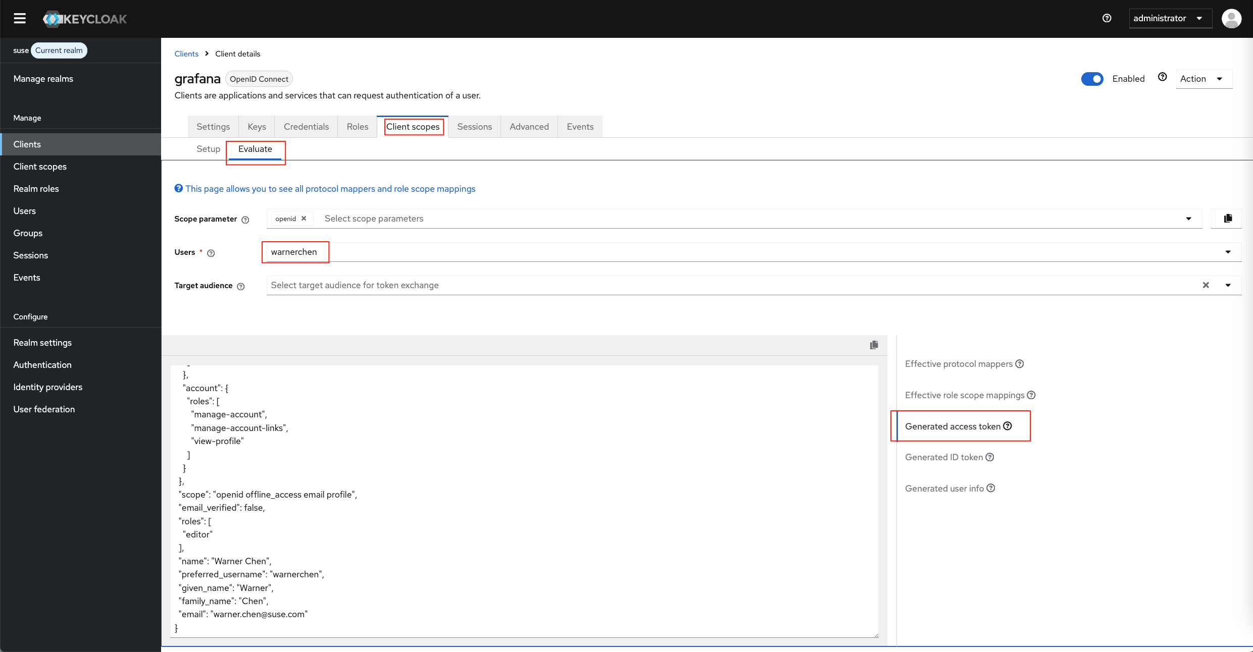 回到 Client -> Client scopes -> Evaluate,选择刚刚创建的 User,在选择 Generated access token: