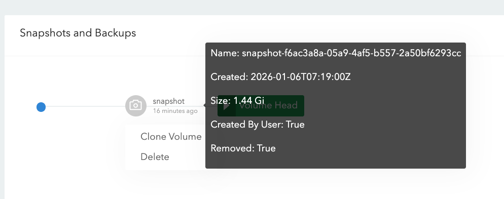 HV 创建的 VM 以 LH 作为后端存储,因此在创建 VM Snapshot 时,本质上是在对应的 LH Volume 上创建 Snapshot。若删除 VM Snapshot,LH 会将该 Snapshot 标记为 Removed: True,此时该 Snapshot 将无法再用于恢复: