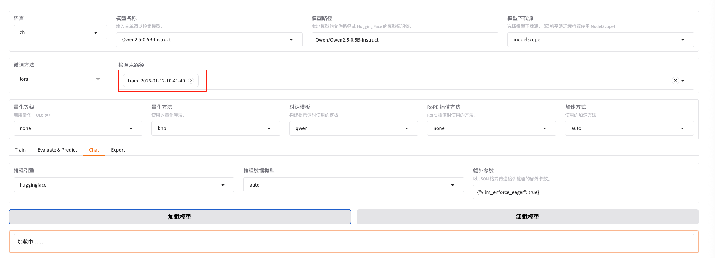 选择需要微调的模型 -> Chat -> 加载模型,检查模型是否可用(可以使用本地下载好的模型,或者从公网下载):