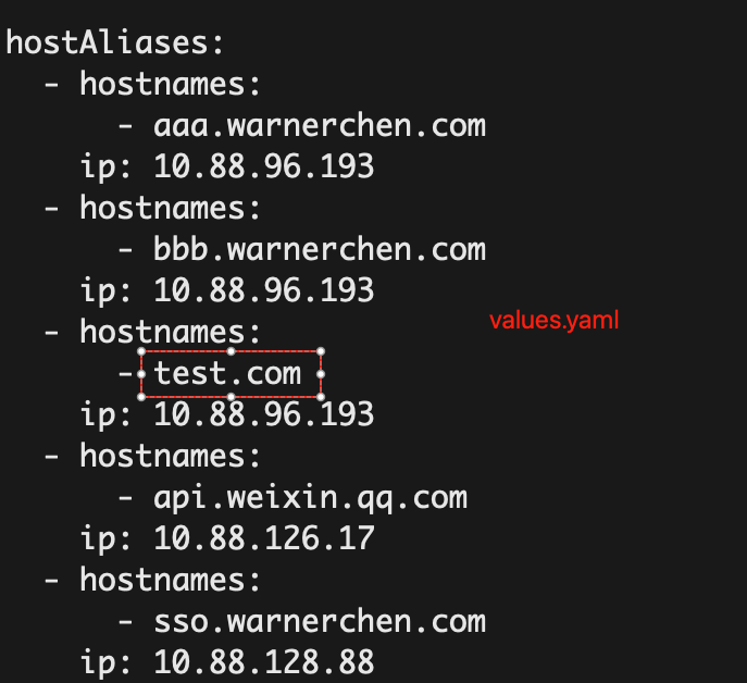 hostAliases 在 Kubernetes 中属于列表型字段,其合并策略是 以 ip 作为唯一合并键。