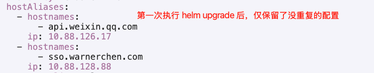 在 Helm Chart 的 values.yaml 中定义了 hostAliases 配置。修改该配置并执行 helm upgrade 后,出现以下异常现象: