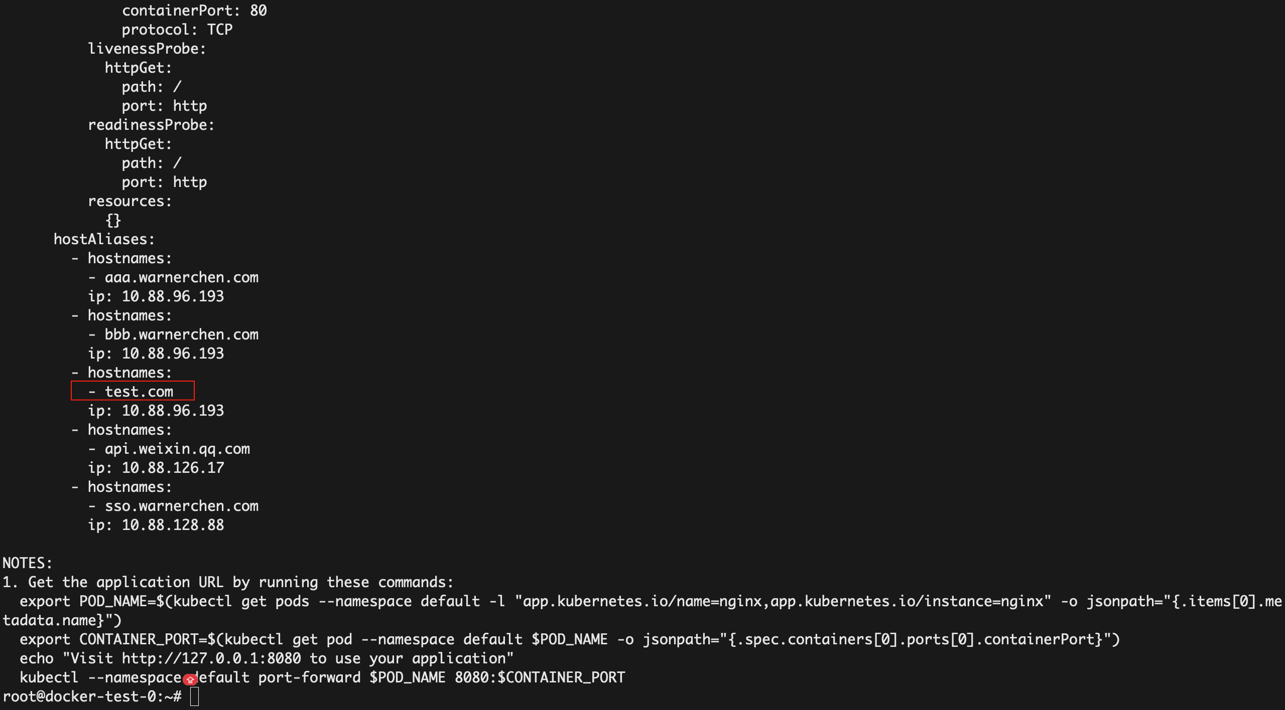第二次执行完成后,hostAliases 配置即可按预期生效: