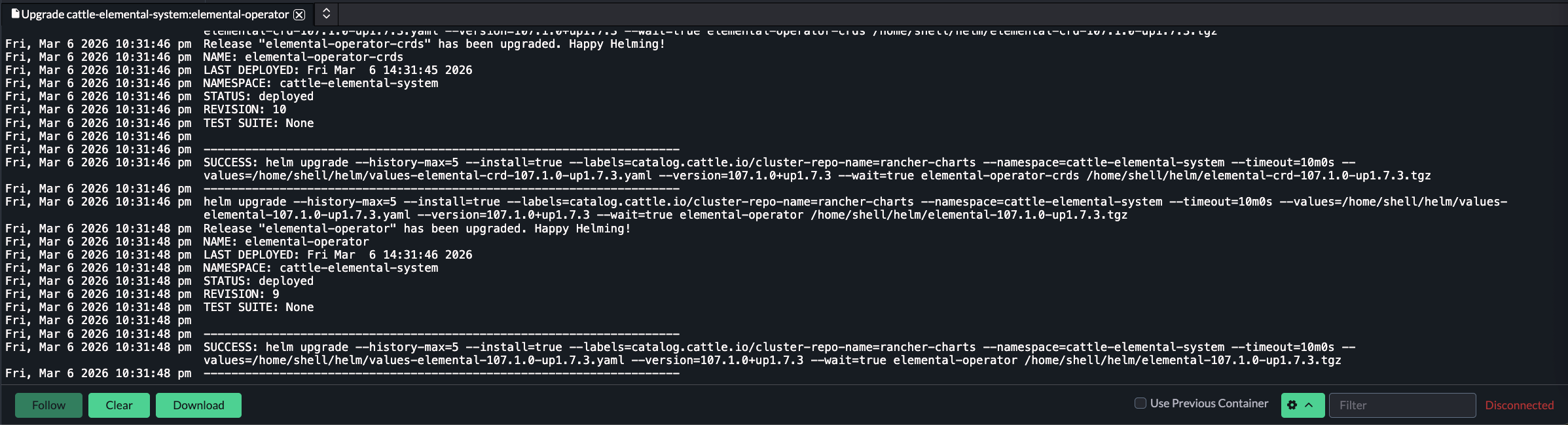 通过 Rancher UI 升级 Elemental 的时候(Helm Upgrade),出现如下报错: