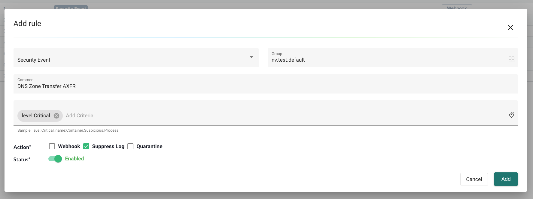 NeuVector 默认内置了一些网络规则。当这些规则被命中并触发告警时,某些告警可能不会提供 Review Rule 按钮用于直接加白。如果该告警属于误报(即应用的正常行为),就可能持续产生大量告警,从而造成告警噪音。
