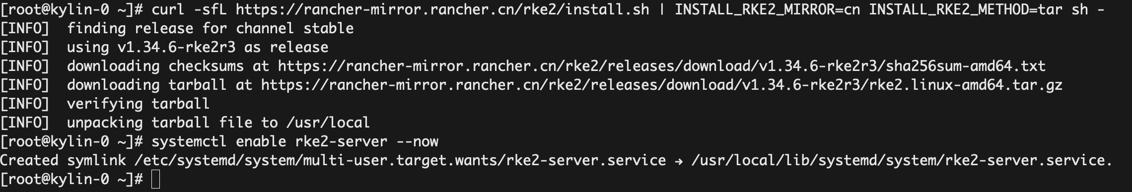 1 | curl -sfL https://rancher-mirror.rancher.cn/rke2/install.sh | INSTALL_RKE2_MIRROR=cn INSTALL_RKE2_METHOD=tar sh - |